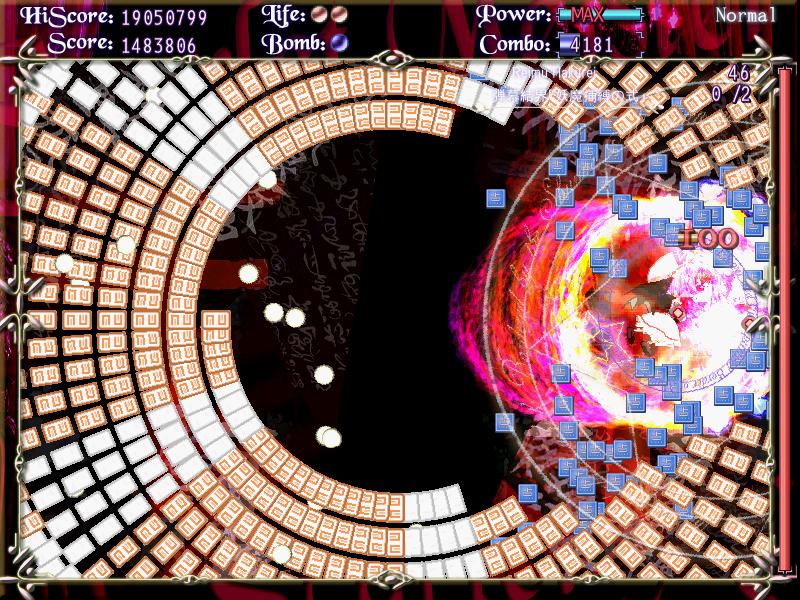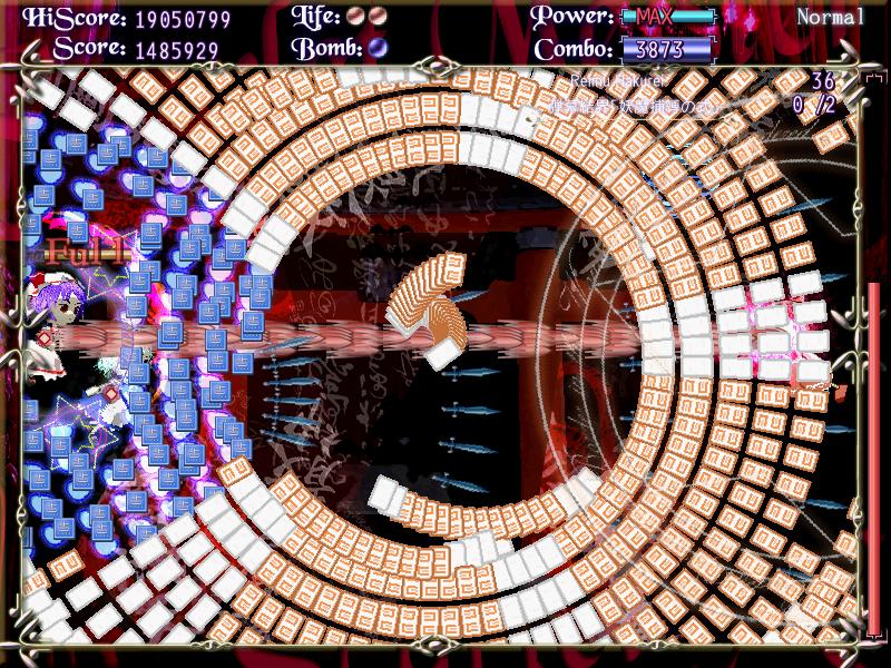 | 設置が終わったら即霊撃 |  | そのまま右に移動 |  | 中央に戻って撃ち込み。後ろから弾が迫ったらまた霊撃 |  | そのまま左端まで移動 |  | ちょうどフルパワーで設置弾が消えるので中央に戻る |  | 適当に霊撃して張り付けば終了 |